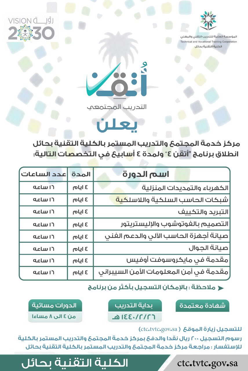 التدريب التقني On Twitter بادروا بالالتحاق في أ تقن دورات مسائية قصيرة موجهة لأفراد المجتمع في ١١ تخصص تقني و مهني للجنسين بمعظم مناطق المملكة للتسجيل Https T Co Jeutojll2u Https T Co Gxi4wblr1t