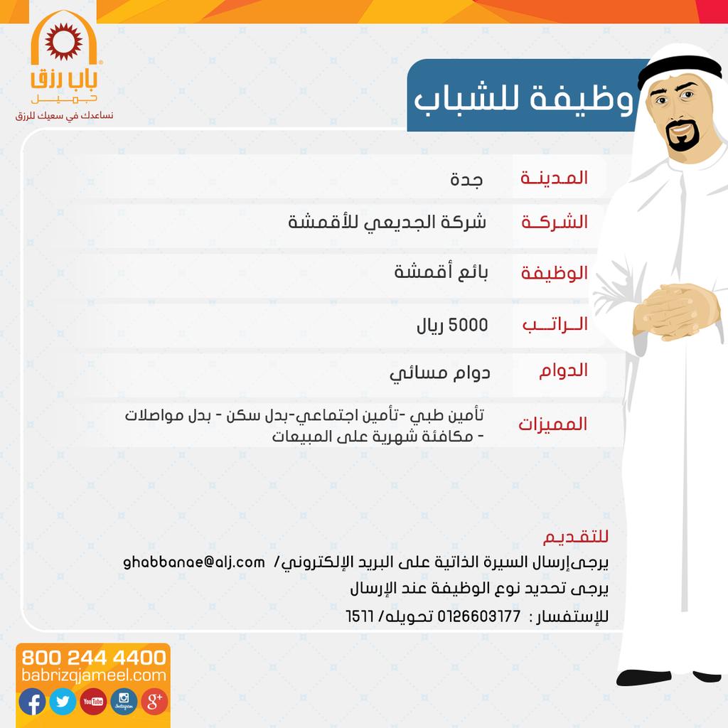 باب رزق جميل Bab Rizq Jameel On Twitter وظائف للشباب في جدة شركة الجديعي للأقمشة توظيف وظائف شاغرة Http T Co Lhuxamcu6q