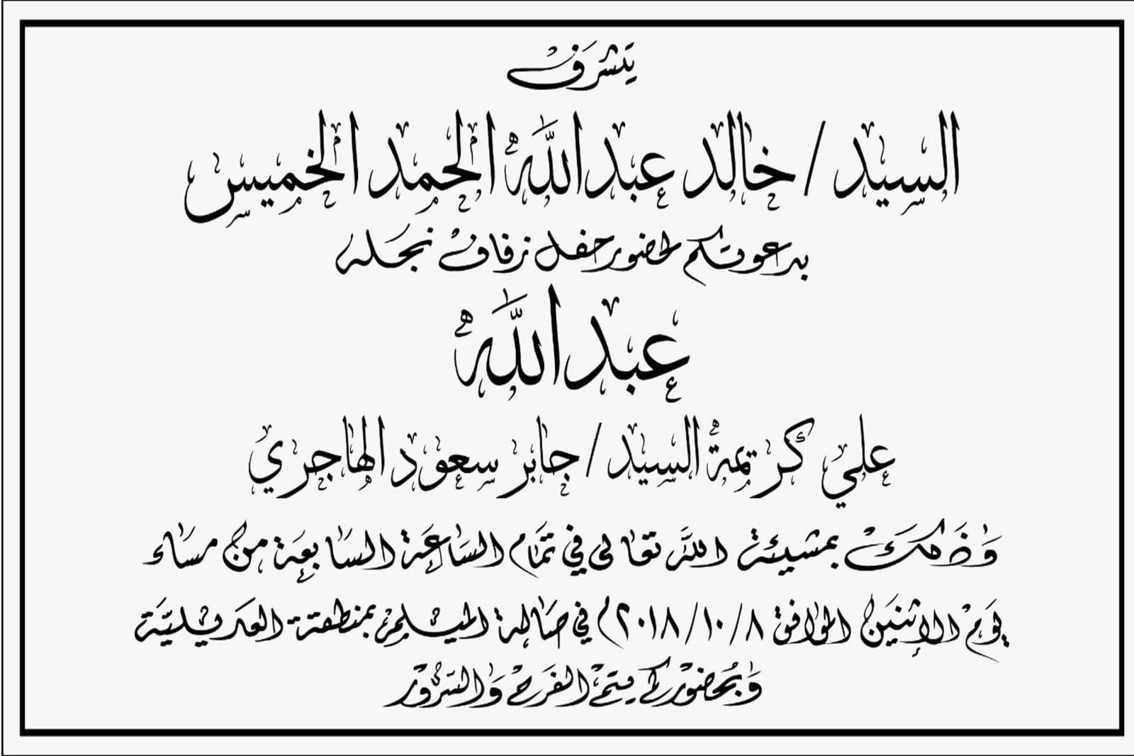 أسرة الخميس On Twitter يتشرف العم خالد عبدالله حمد الخميس بدعوتكم لحضور حفل زفاف نجله عبدالله على كريمة السيد جابر سعود الهاجري يوم الاثنين 08 10 2018 في صالة الميلم في دولة الكويت