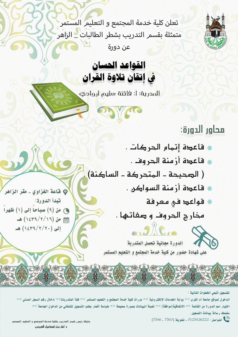 كلية خدمة المجتمع Pa Twitter اختتم قسم التدريب بكلية خدمة المحتمع والتعليم المستمر بجامعة أم القرى دورة القواعد الحسان في إتقان تلاوة القرآن بنجاح باهر ولله الحمد Https T Co 0hiyrsyzyw