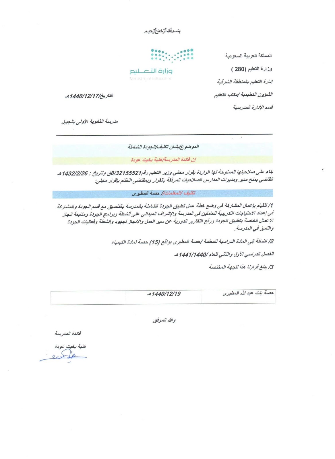تعميم التأكيد على استقرار وثبات عمل منسق ة الجودة في لجنة التميز والجودة بالمدرسة